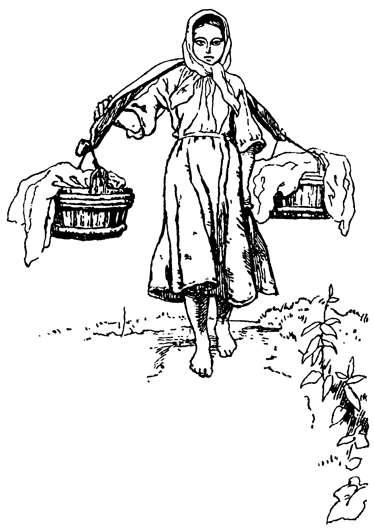Кто сказал, что бадейки тяжёлые? Вон как быстро мчат их под горку Костя и Стёпка с Гараськой. Груня едва поспевает за ними с коромыслом в руках.