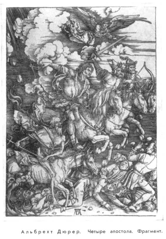 Дюрер пишет свою последнюю картину-завещание "Четыре апостола". Он послал к нам, далеким потомкам, своих современников — людей мятежа и преобразований, мыслителей и борцов, сознающих высшее назначение своего существования. Людей Реформации и великой Крестьянской войны. Грубая мужицкая сила органично соединяется с тончайшими проявлениями ума и силой страсти. Струится к нам ток напряженнейшей человеческой мысли, и мы садущаем ее беспокойство и величие.