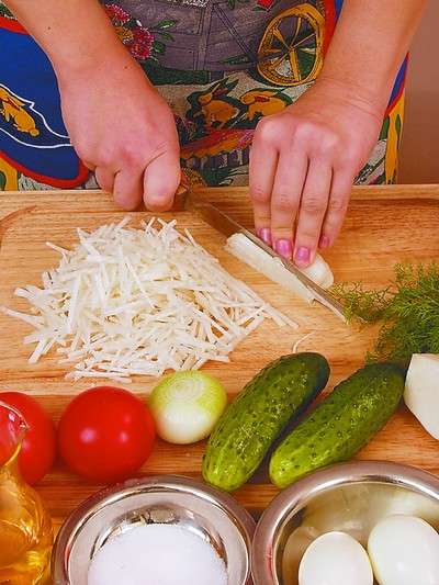 Некрупную редьку вымыть, очистить от кожицы и нашинковать.