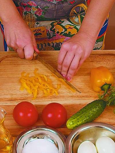 100 г макарон, 1/2 желтого и 1/2 красного болгарского перца, 1 красный или желтый помидор, 1 огурец, 2 ст. ложки растительного масла, листья салата, зелень петрушки, соль, перец черный молотый.