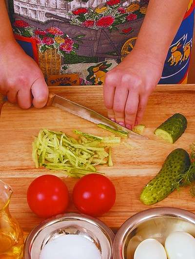 Огурец, не очищая от кожицы, мелко нарезать соломкой.