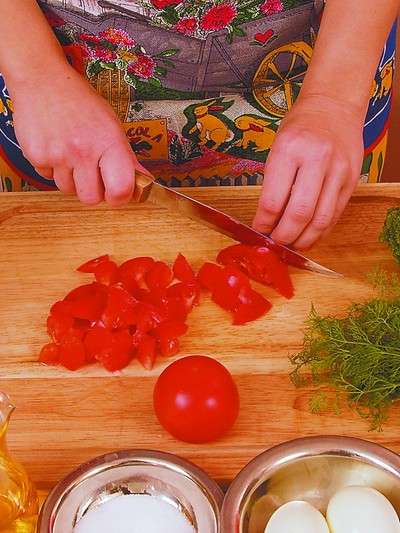 Средних размеров помидор аккуратно нарезать небольшими кубиками.