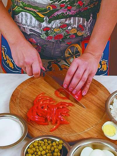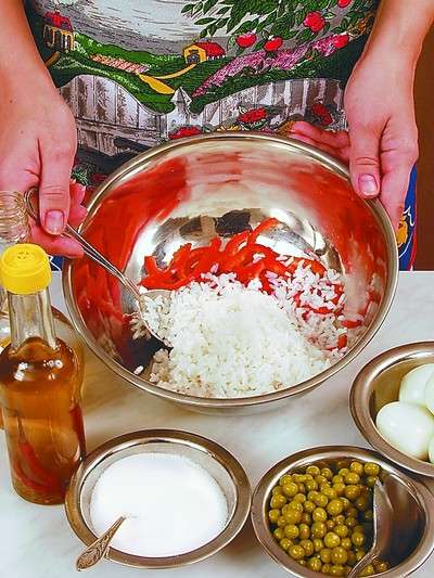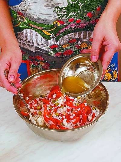100 г риса, 1–2 красных болгарских перца, 70 г зеленого горошка, 2 яйца, 2–3 ст. ложки растительного масла, 1 ст. ложка уксусной эссенции, зелень петрушки, соль, сахар по вкусу.