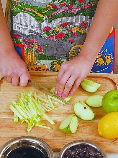 Яблоко, не очищая от кожицы, нарезать соломкой, удалив предварительно сердцевину. Чтобы яблоко не потемнело, сбрызнуть его соком лимона.