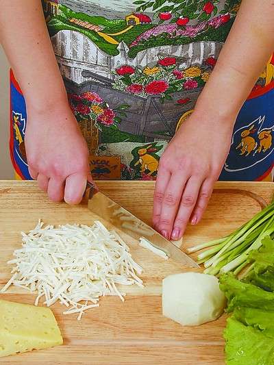 Отваренный картофель очистить от кожицы, нарезать кубиками.