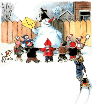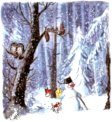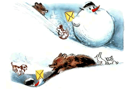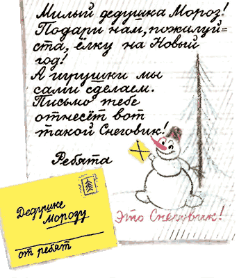 — Снеговик, Снеговик, Храбрый снежный почтовик, В тёмный лес пойдёшь И письмо снесёшь. Дед Мороз письмо получит — Найдёт в лесу ёлочку Попушистее, получше, В зелёных иголочках. Эту ёлку поскорей Принеси для всех детей!Наступил вечер, ребята домой ушли, а Снеговик и говорит: