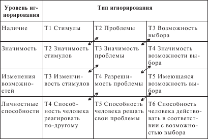 Нарисуйте матрицу игнорирования для следующего воображаемого случая. Например, муж и жена только что легли и засыпают. В этот момент в соседней комнате раздается плач их ребенка. Муж говорит жене: «Как ты думаешь, надо ли кому-нибудь из нас пойти и посмотреть, почему он плачет?» Продумайте ответы жены, если она будет игнорировать в каждой диагонали матрицы игнорирования (см. стрелки на матрице). Убедитесь в том, что «иерархия игнорировании» применима и для этого случая.