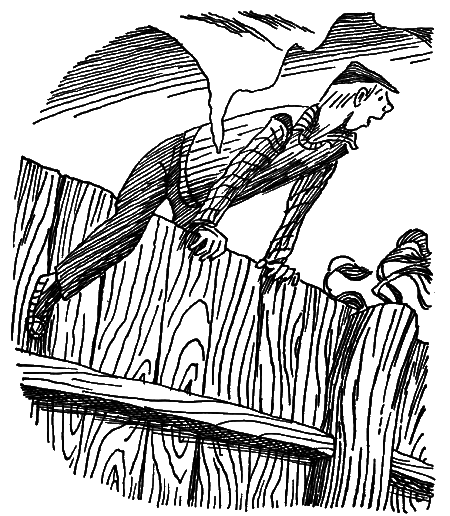 Петька даже пожалел Витьку. Сидел он на чужом заборе между двумя чужими дворами. С одной стороны рычал на него и скалил страшные клыки большой пёс, а с другой — бесновалась могучая старуха. Положение его было отчаянным. И Витька пошёл на прорыв. Молча прыгнул он с забора прямо на шарахнувшуюся бабку, промчался по двору и вылетел на улицу.
