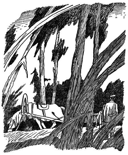 Лошадь неторопливо бежала по дороге, заросшей травой и пересечённой корнями. По обе стороны стоял плотный, ровный лес. Он менялся: становился светлее, темнее, выше, ниже, но от дороги не отходил. Временами дорога спускалась в прохладные овражки и снова выбегала из них в сухую пахучую жару. Иногда лес отступал, появлялись яркие зелёные низинки, и тогда на Петьку набрасывались мухи. Они с противным жужжанием носились вокруг его головы, лезли в глаза и в нос. Петька отмахивался, бил их панамой, но мухи отставали только в лесу. От этого лес казался ещё лучше. Вот стоит высокий пень, очень высокий, а рядом лежит сломанная сосна. Кто её сломал? Ветер или, может быть, медведь? Тётка, наверное, знает. А вот ёлочки маленькие столпились, как девчонки на переменке. Берёза через дорогу наклонилась, будто ворота, и на ней птица сидит. Что за птица? Не улетает, не боится почему-то. А вот лужа с чёрной водой. Телега по луже едет, как корабль плывёт, и от лужи в траву упрыгивают лягушки.