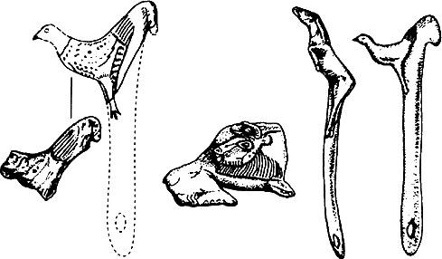 Академик Б. А. ыбаков трактует рисунок куда более оптимистично. Он полагает, что охотник удачно поразил бизона, метнув копье с помощью копьеметалки. Палеолитическая копьеметалка обычно изготовлялась из кости или рога, часто изящно украшалась изображениями птиц или быстрых зверей (рис. 6, 7) и имела крюк на одном конце и отверстие для темляка — ременной петли на другом. Такие приспособления и их обломки археологи находили неоднократно.