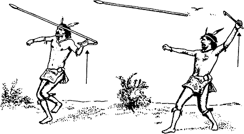 Такой метод броска сохранился до исторического времени. Испанские конкистадоры в Мексике и Техасе еще застали индейцев, метавших копья с помощью атлатла — разновидности копьеметалки. Атлатл — полуметровый кусок твердого дерева с упором для копья. Как его применяли, показано на рисунке 8.