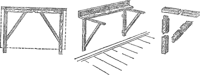 Ножки изготавливают, как показано на рисунке. Сбивают их гвоздями и делают шириной, равной ширине крышки. Затем ножки вставляют концами в пазы между шпонками, скрепляют гвоздями и прибивают к ним длинные проножки.