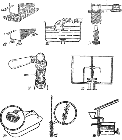Если гараж не оборудован водопроводом, можно устроить простейший водосборник. Он представляет собой бак, снабженный краном и переливной трубой. Пополняется бак дождевой водой, которая собирается с крыши (26).