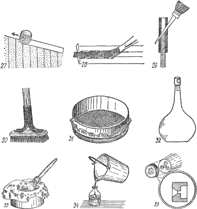 Если на слое краски образовалась пленка, процеживать ее вовсе не обязательно. Достаточно опустить в банку кусок капронового чулка и кисть можно будет макать прямо через чулок. Краска при этом используется полностью, без потерь (33).