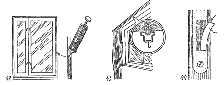 Определяя место в косяке двери для гнезда под ригель замка, вырежьте из бумаги прямоугольник, по площади равной торцу ригеля. Одну сторону этого прямоугольника смочите водой и точно приложите к торцу ригеля, а затем другую сторону (лицевую) смажьте клеем. Закройте дверь, и поворотом ключа прижмите ригель к косяку двери. Бумажный прямоугольник приклеется к косяку, обозначив точное место гнезда для региля (44).