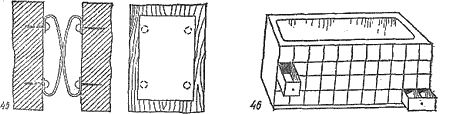 Когда низ ванны облицовывают кафелем, то обычно оставляют смотровой люк для ремонта и для того, чтобы под ванной можно было хранить хозяйственные мелочи. Однако гораздо удобнее вместо люка сделать выдвижные ящики. Тогда вещи лучше сохраняются, и их не надо разыскивать на полу под ванной. Если потребуется произвести ремонт, ящики вынимают совсем (46).