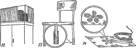 Чтобы школьник правильно сидел за столом, приходится иногда подкладывать на стул книги, подушки и т. д. Высоту стула можно увеличить за счет наращивания ножек. Деревянные вставки вкладываются в отрезки толстостенного резинового шланга, и эти отрезки надеваются на ножки стула. Со временем вставки можно укоротить, а потом и снять (53).