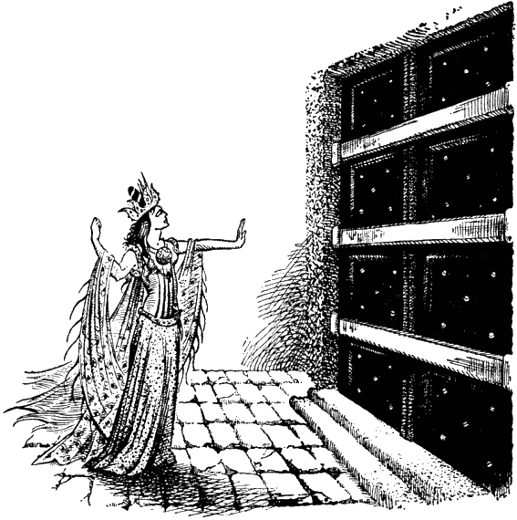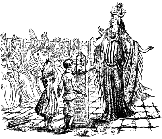 Дети смотрели друг на друга поверх невысокой колонны, а колокол ещё подрагивал, хотя и не звенел. Вдруг в дальнем углу что-то зашумело. Они быстро обернулись и увидели, что одна из фигур, самая последняя, поднимается с места (как вы поняли, именно та, кого Дигори счел красивой). Когда она встала, дети увидели, что она невиданно высока. Не только одежды и корона – сверкание глаз, изгиб губ говорили о том, что это великая властительница. Медленно оглядев залу, она увидела обломки, заметила детей, но удивления не выказала и быстро, большими шагами подошла к пришельцам.