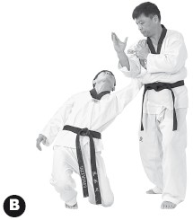 Левой рукой захватите запястье левой руки противника. Одновременно нанесите удар ладонью левой руки в горло противника. Затем подтяните вперед левую ногу. Захватите левой рукой кисть противника и разворачивая его по часовой стрелке вовнутрь, надавите правым локтем на предплечье противника.