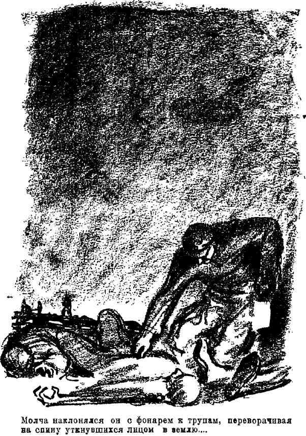 Молча наклонялся он с фонарем к трупам, переворачивал на спину уткнувшихся лицом в землю, обтирал кровь с рассеченных лиц и… внимательно рассматривал убитых. Обошел все поле. Прошел несколько раз к мосту, у которого складывали трупы. Смотрел под мост, пытаясь фонарем осветить темноту под кучей правого берега, под устоями моста.
