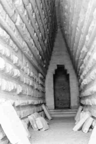 На Руси курганы-помещения строили вплоть до XX века. Правда, в них уже не жили, но использовали их как кладовые. В русских деревнях они назывались «выходами» или «вавилонами»! Словарь В. Даля сообщает: «Выходы, выхода, астрах. вавилоны, выход, рыбный погреб, подвал сложного устройства» [223], т.1, столбец 796. Эти выходы-вавилоны до сих пор можно увидеть в некоторых русских деревнях, рис.19.104. Они делаются небольшого размера, из дерева и камня, и засыпаются сверху землей. По своему устройству это – типичный курган. Внутренняя планировка такая же, как, например, у «Царского Кургана», который обсуждался выше. Длинный проход-коридор, заканчивающийся входом в большую квадратную внутреннюю камеру. В русских деревнях выходы-вавилоны складывают не только из камня, но чаще из дерева. Потому что на Руси дерева больше, чем камня. В более южных областях естественно чаще использовался камень. Мы видим, что в русском языке название «вавилон» употребляется именно для сооружений старого вида, появившихся еще до изобретения связующего раствора. Именно такие архаичные дома-пирамиды и были построены в Египте. В то же время большие египетские пирамиды возведены на очень высоком уровне строительной техники. Вероятно, их создатели, ордынские завоеватели XIV-XVI веков, воспроизвели в их устройстве архаичную русско-ордынскую форму. И это понятно. Поскольку в Египте было устроено царское кладбище Великой = «Монгольской» Империи. И естественно, что при этом был воспроизведен архаичный тип сооружений, то есть «как строили предки». Но с использованием самых современных в то время строительных технологий. Например, был использован бетон.