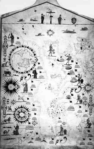 В следующей книге, ХРОН6, мы покажем, что государство Египет, описанное в Библии, это – средневековая Русь-Орда. Кроме того, еще одним названием Руси-Орды, вероятно, было Вавилон или Вавилония. Скорее всего, происшедшее от слова Белая Русь. Поэтому следует ожидать, что имперское название Вавилон должно присутствовать и в «древней» истории современного африканского Египта. Поскольку именно здесь, согласно нашей реконструкции, находилось главное царское кладбище великих царей-ханов «Монгольской» Империи. То есть особо почетное кладбище Вавилонии-Орды или Белой Орды. И действительно, до нашего времени дошли старые карты, на которых египетский Каир и его окрестности обозначены как Вавилония. Одну из таких карт – редкую карту-портолан 1599 года мы приводим на рис.19.107. Вместо названия каир здесь написано Вавилония. При этом над городом развевается флаг с османским=атаманским полумесяцем, рис.19.108, см. [1058], с.109.