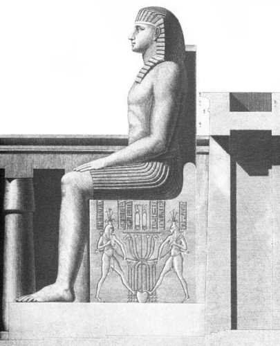 На рис.19.127 мы приводим рисунок Колосса Мемнона, вид сбоку, сделанный в 1832 году Фредериком Казервудом. А на рис.19.128 показана прорисовка самой сцены воздвижения христианского креста на боковой стенке трона Колосса. Опять-таки полезно сравнить рисунок Казервуда, рис.19.128, рисунок художников Наполеона, рис.19.124, и современную фотографию, рис.19.47.