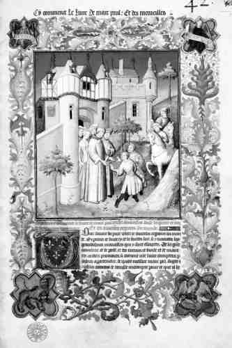1) Книга Марко Поло открывается роскошной цветной миниатюрой, изображающей начало пути Николая и Матвея Поло из Константинополя, рис.14.13. Обращает на себя внимание исключительно дорогое и нарядное исполнение книги. Кстати, цветные травяные узоры напоминают оформление русских рукописных книг XVI-XVIII веков.