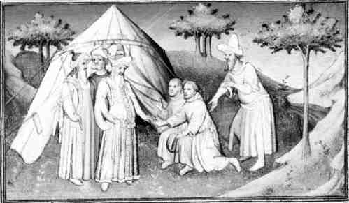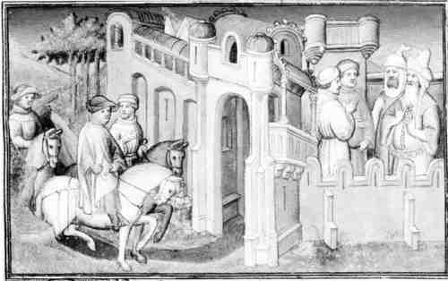 3) Николай и Матвей Поло приближаются к воротам города великого хана, рис.14.15. Изображен каменный город среди лугов. У хана и его приближенных – вполне европейские лица.