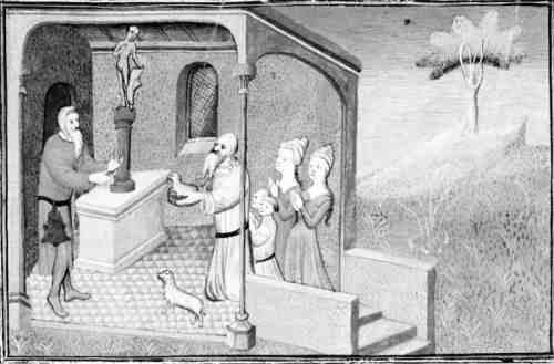 Люди с европейскими лицами и в европейских одеждах молятся золотому идолу. По-видимому, показана молитва в православном храме перед позолоченными иконами. Которые были изображены западноевропейскими художниками, не понявшими сути дела, в виде отлитой из золота статуи идола. Между прочим, само название Тангут означает, по-видимому, Танские или Донские Готы. То есть Танские или Донские Казаки.