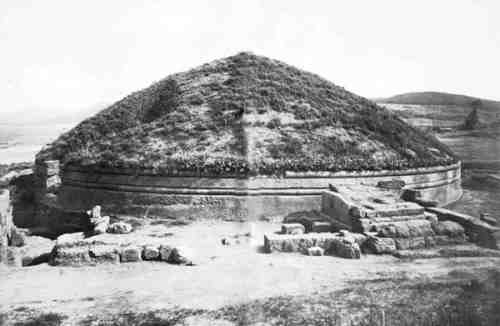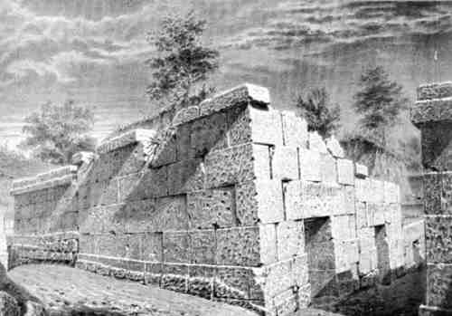 На рис.15.1 показан один из многочисленных этрусских некрополей в Италии (necropoli della Banditaccia a Cerveteri), относимый историками к VII веку до н.э. Он напоминает своей формой скифские курганы. На рис.15.2 представлен внутренний вид другого этрусского некрополя в Италии, якобы VI века до н.э. [1410], с.42. Другой тип эт-русских некрополей представлен на рис.15.3. На рис.15.4 мы видим развалины этрусского храма.