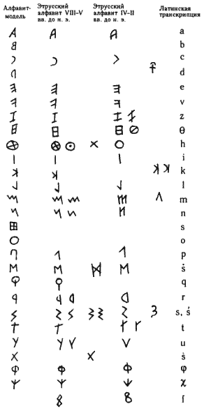 Для сравнения приведем также таблицу перевода эт-русских букв, используемую в современной этрускологии. См. рис.15.8. Мы взяли ее из книги А. И. Немировского [90]. Она очень сильно отличается. Причем, как следует из книги А. И. Немировского, с ее помощью пока не удалось понять эт-зрусские тексты.