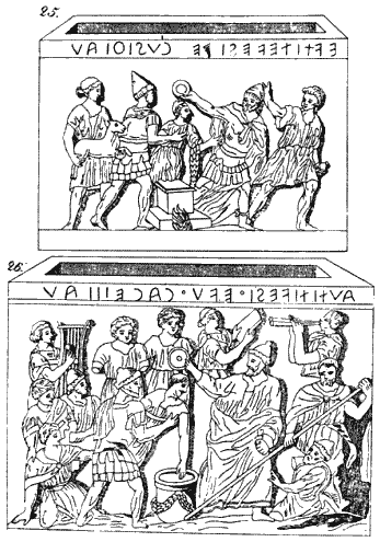 Вот еще одно эт-русское зеркало, якобы III века до н.э., – в которое смотрелись эт-русские, то есть попросту русские, женщины, рис.15.21. Как мы теперь понимаем, перед нами – русские люди XIV-XVI веков, заселившие Италию. Строили дома, воевали, растили детей. Между прочим, изображали они себя так, как сегодня принято представлять исключительно «древних греков и римлян». Венки на головах, свободные южные одежды. Между прочим, внизу – юноша с крыльями и двумя рыбами в руках. Он изображен как бы на фоне двуглавого имперского орла, то есть христианского креста.