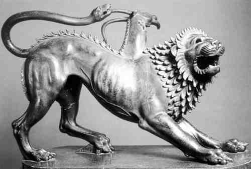 В заключение приведем изображение известной эт-русской бронзовой статуи устрашающей Химеры, рис.15.31. Якобы IV век до н.э. Скорее всего, подобные изображения, как и мрачная голова Горгоны-Медузы с волосами-змеями, воспринимались как некие символы великого = «монгольского» завоевания.
