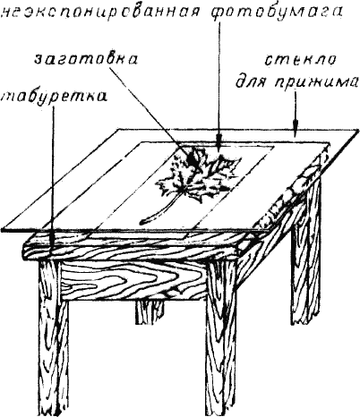 Положите на ровную сплошную горизонтальную поверхность например табуретку, лист фотобумаги эмульсионной стороной вверх (рис. 1). На бумагу положите заранее приготовленные заготовки (предметы, фигурки, вырезанные из плотной бумаги или картона). Теперь проэкспонируйте фотобумагу, включив в помещении свет. Освещение должно быть по возможности равномерным. Заготовки не должны отбрасывать теней (если это не специальный художественный прием). Продолжительность засветки находящейся под потолком лампой мощностью 100 Вт приблизительно 5–7 с. Можно использовать настольную лампу и поднести ее ближе к фотобумаге, тогда время экспонирования уменьшится. Вообще продолжительность засветки зависит от многих факторов и выбирается опытным путем. Например, особо контрастная фотобумага менее чувствительна, чем все остальные фотобумаги, и продолжительность засветки может быть увеличена в 2 раза. Необходимо также помнить, что продолжительность засветки прямо пропорциональна квадрату расстояния до источника света и обратно пропорциональна его яркости.