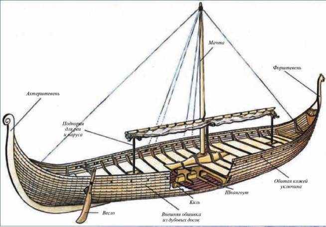 Согласно современным представлениям, их корабли не годились для дальних плаваний, однако именно на них викинги совершали путешествия на огромные расстояния не только в Средиземноморье, но даже к берегам Америки за 500 лет до Колумба. Длинные, узкие, с небольшой осадкой суда обычно приводились в движение веслами. Имелась и мачта с большим прямым парусом, который ставился при попутном ветре. Сначала корабли имели не больше десяти весел по каждому борту и команду из 60 человек, сменявших друг друга у весел (позже, на более крупных судах, использовалось 60 гребцов одновременно). В отличие от галер Средиземноморья ладьи викингов несли только свободных людей, каждый из которых являлся отличным, закаленным воином. На бортах корабля висели круглые щиты с эмблемами или гербами их владельцев. Оружием служили дротики, копья, стрелы и мечи, а доспехи состояли из короткой кольчуги.