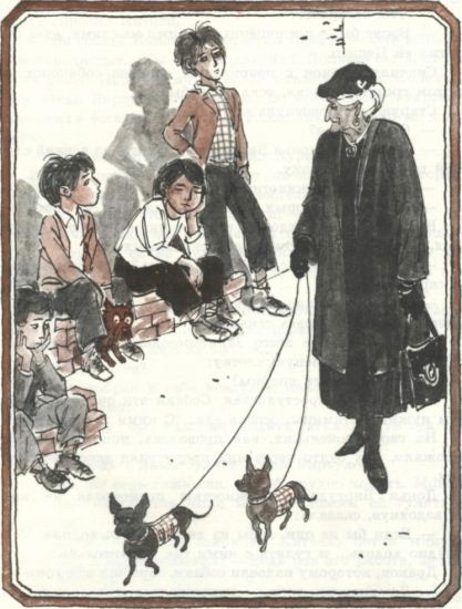 В конце двора, где скоро должны были проложить тротуар, появилась донья Виртудес. Это была сухонькая, аккуратная старушка, одетая во всё чёрное. На шее у неё висел медальон с портретом покойного мужа. На двух красивых поводках она вела очень маленьких и тощих собачек с глазами навыкате.