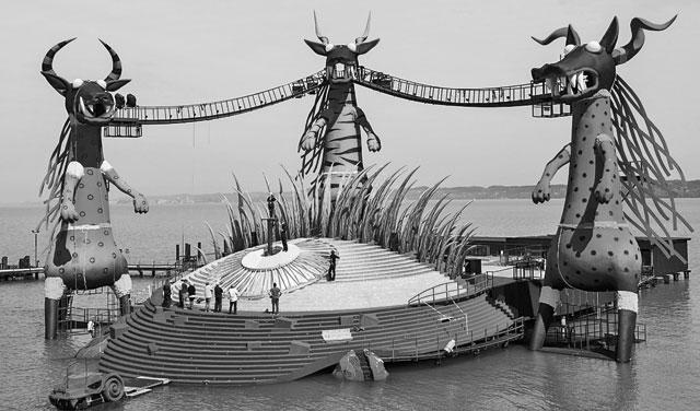 В Австрии начались репетиции номеров для ежегодного Брегенцского фестиваля искусств, который начнется в июле. Театральные представления разыгрываются на фантастических сценах, дрейфующих у берега Боденского озера.