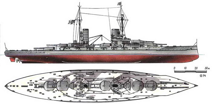 Внизу: линейный крейсер после Ютландского боя с демонтированными орудиями первой башни, июнь 1916 г.