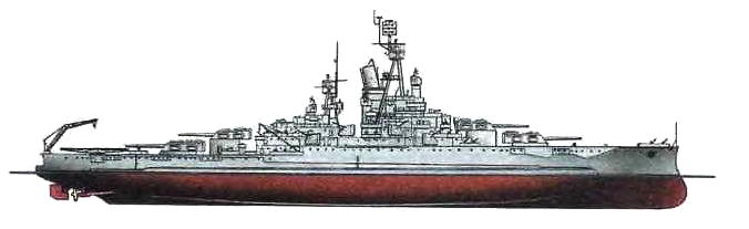Водоизмещение стандартное 29150 т, полное 33500 т. Длина максимальная 189,1 м, ширина 32.2 м, осадка 10,8 м. Мощность турбин 40000лс, скорость 20,5уз, Броня: пояс до 330мм, верхний пояс 152 мм, башни 330-152 мм, палубы 25+25+25мм, рубка 152 мм. Вооружение: по 8 381мм и 152-мм орудий, 8 102-мм зенитных пушек. 24 40-мм и 46 20-мм зенитных автоматов. Внешний вид корабля показан по состоянию на 1944 г.