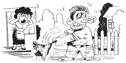 I на гэты раз ён убачыў у лебядзе пеўніка. Зірнуў на ўсе бакі — нікога, падкраўся і што ёсць сілы падфутболіў таго аб фундамент хаты. Ды так, што пеўнік адразу выцягнуў ногі. Схапіў за іх Завідаў, трасца на яго — што гарбуз цяжкі, і хацеў гэта пусціць за плот суседа ў бульбянік, але тут выбягае на ганак жонка: