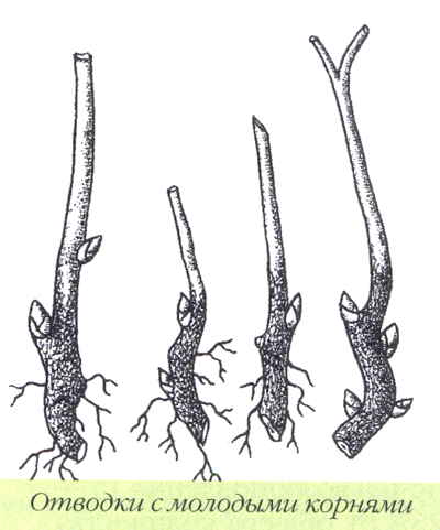 Проверить сорт на способность размножения отводками можно на одном побеге. Для этого молодой побег куста, растущий несколько в стороне, рано весной, как только он показался из земли, пропускают в донное отверстие горшка. На его дно насыпают землю и по мере роста побега её все время подсыпают и держат во влажном состоянии. В течение лета побег укореняется. Весной следующего года укореняющийся стебель срезают под горшком, выбивают из него и проверяют - есть ли почки. Главное для укоренения и появления придаточных корней у отводков - не допускать пересыхания земли в горшке. Приживаемость отводков и выход посадочного материала зависят от сорта.