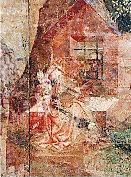 Описываемый сюжет со святым Макарием мы находим на правой от входа фреске. Но и на левой стене есть изображения, имеющие много общего с жизнью и личностью Бенвенуто. Там находится фреска, которая называется «Жизнь анахоретов». И хотя название предполагает, что анахоретов там несколько, мы видим одного и того же персонажа, отшельника в той же красной шапочке, кадр за кадром, как в кино, проживающего свою жизнь.
