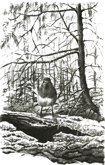 Так незаметно, песня за песней, и подошёл глухарь к сосне, за которой я стоял. Я, осторожно переступив с ноги на ногу, зашёл за ствол дерева. Надо же, не видит меня! А уж порядком рассвело — лишь небольшая мгла в лесу держится.
