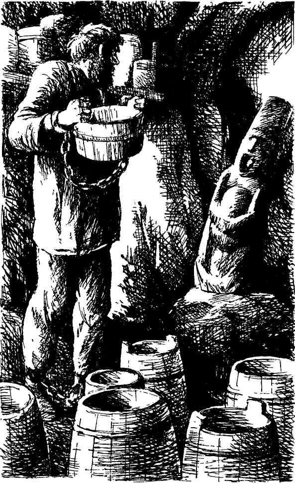 Барма, откинув творило, спустился по каменным ступеням. За двустворчатыми, неплотно прикрытыми дверьми была каменная пещера. «Может, та самая? — подумал Барма. — Никитка говорил, на острове». В глубине пещеры, посреди пней, кореньев, досок, щепы и стружек стоял на коленях громоздкий человечище и, запрокинув лагун, пил из него не то вино, не то воду. С неохотою оторвавшись, зловеще усмехнулся, фыркнул. Язычок фонаря качнулся, лизнул стекло.