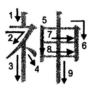 Какая же основа заложена в графику «божественного» знака? В первую очередь обращает на себя внимание левая часть (ключ) иероглифа , которая, с одной стороны, чрезвычайно похожа на знак азбуки Катакана (нэ), а, с другой стороны, имеет много общего с элементом (одежда). Формальная близость знаков и не замешана на какой-либо серьёзной основе: если знак является производной от кандзи (И_коромо) - одежда, то происходит от иероглифа , современное значение которого - «показывать», «указывать», и который, как считается, берёт своё начало от стилизованного изображения жертвенного алтаря (в знаке легко распознаётся подобие столика на трёх ножках, на котором, возможно, покоится приносимый в жертву богам кусочек мяса или какое-нибудь животное).
