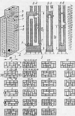 12—15-й ряды – это варочная камера. Ее боковые стенки образуют поставленные на ребро кирпичи (разумеется, самые прочные и ровные). Варочная камера перекрывается асбоцементным листом толщиной 5—10 мм. Его применение значительно упрощает технологию выкладывания и закрепления кирпичей следующего, 16-го, ряда, который образует дно первого полуоборота горизонтального канала.