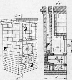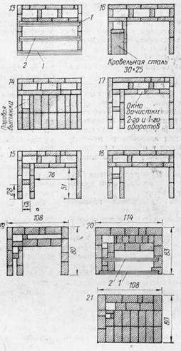 15-й и 1б-й ряды выкладывают обычным способом. Здесь только следует предусмотреть две печурки: малую размером 150х300 мм и большую размером 670x500 мм. После выкладки 16-го ряда на него кладут лист кровельной стали размером 300x280 мм. который будет потолком нижней малой печурки.