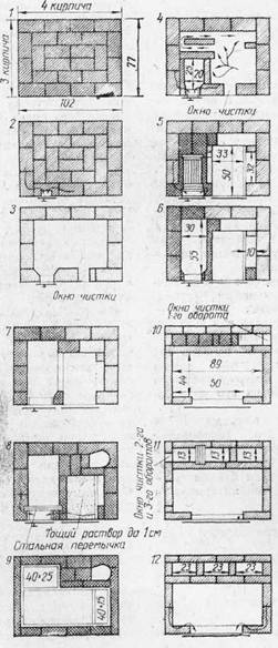 При укладке 18-го ряда необходимо оставить со стороны внутренней стенки большой печурки окно чистки. При этом следует обратить внимание, что внутренние стенки первого и второго каналов не доводят до плоскости перекрытия на 200 и 130 мм соответственно. Верхние грани обеих стенок должны быть стесаны.