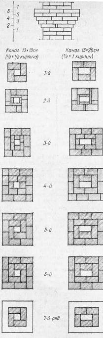 На тягу печи влияет также сопротивление стенок дымового капала движению газов, уменьшить которое можно: сокращением числа дымооборотов печи, увеличением площади сечения дымооборотов и дымохода (напомним, что минимальное сечение – Ѕ х Ѕ кирпича), созданием более гладкой поверхности у внутренних стенок дымооборотов и дымохода.